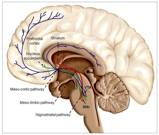 What you are actually craving, when responding to the siren call of your favourite fix, is not satiety, it is dopamine. Dopamine is all about pleasure and reward. It is the messenger, sent from the ventral tegmental area (VTA) of the brain, to another area called the nucleus accumbens, in anticipation or expectation of a reward. Dopamine rises in the nucleus accumbens, giving you that surge of pleasure, or hit.